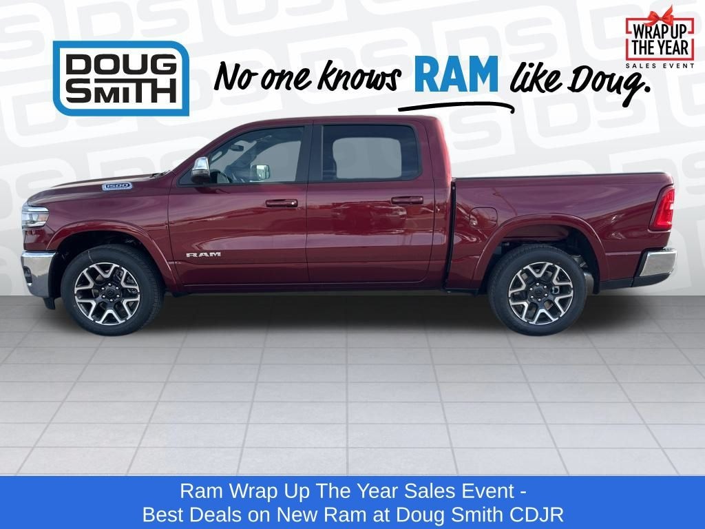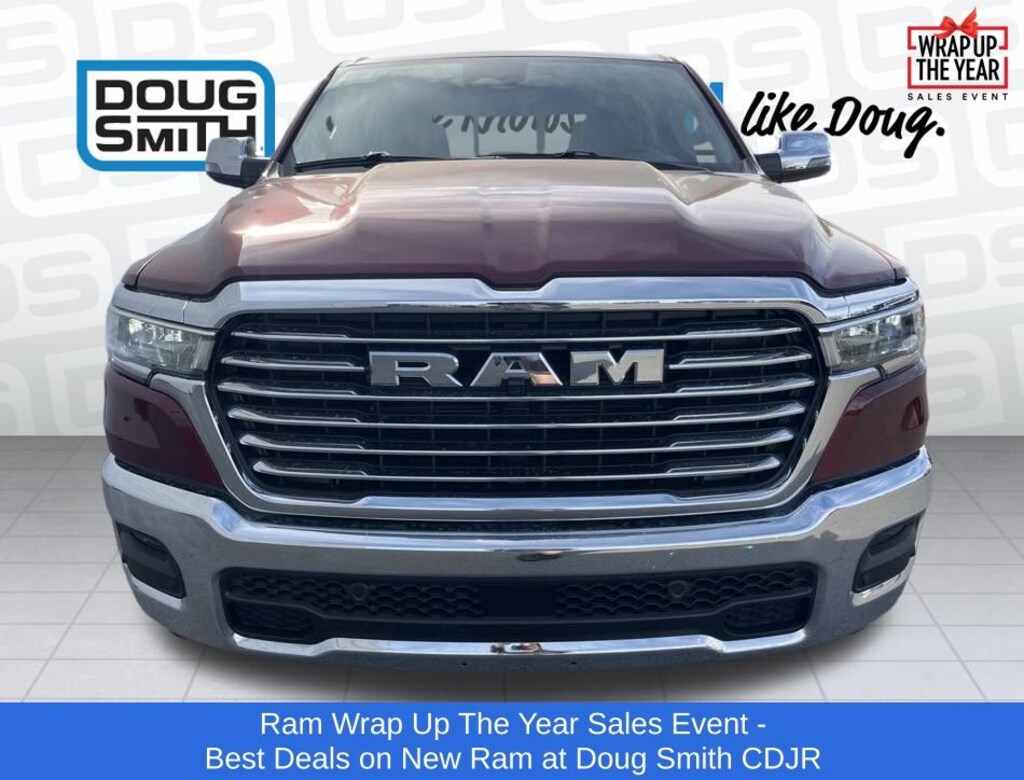 Delmonico Red Pearlcoat 2026 Ram 1500 Laramie 4WD 8-Speed Automatic 3.0L I6 Price includes: $2000 - 2026 National Holiday Select Inventory Bonus Cash. Exp. 01/05/2026 $3500 - 2026 National Retail Consumer Cash . Exp. 01/05/2026 - Sale Price Includes: $1,500 Trade-In Allowance Incentive Program for customers that trade in a 2015 or newer passenger vehicle with 100,000 miles or less. - Offer Exp. 01/05/2026 - See Doug Smith CDJR for full details. - Advertised Price reflects a $1,500 Financing Discount. To qualify for this discount, customer must secure credit approval and finance with a dealership lender. Cash purchases or outside financing will void the discount, increasing the final price by $1,500. Exp. 01/05/2026 - See Doug Smith CDJR for full details.