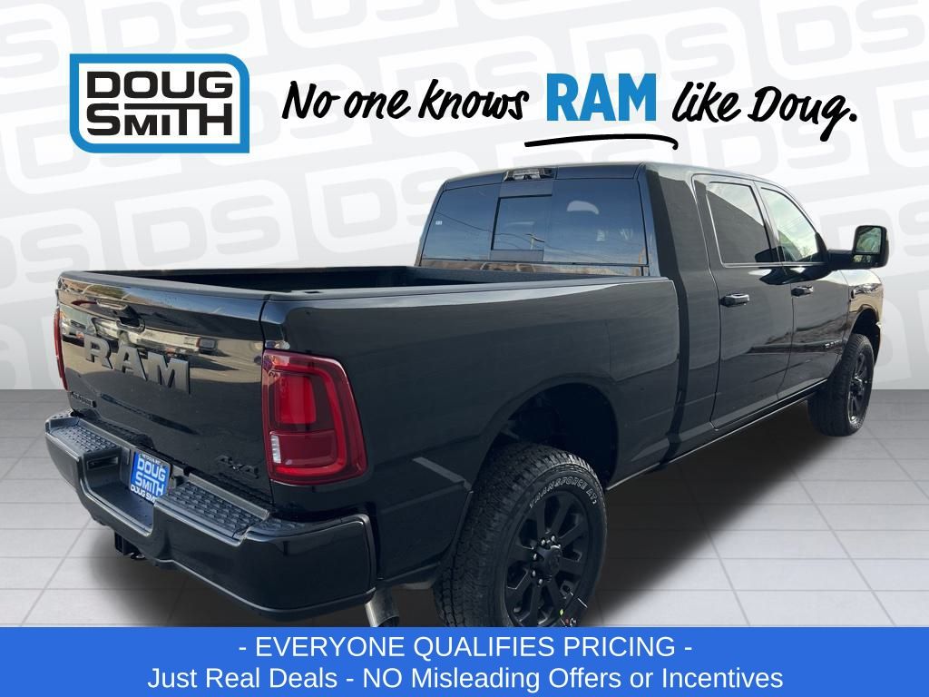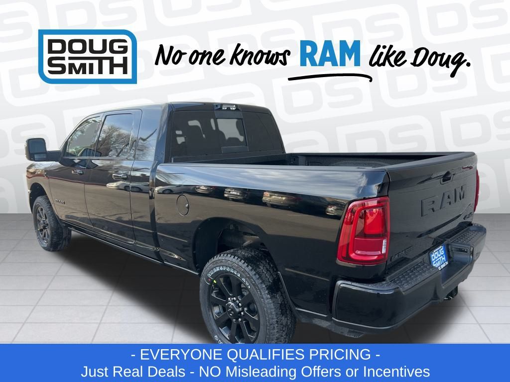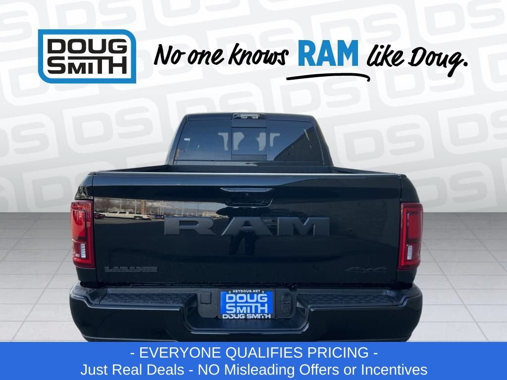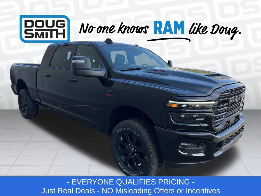 Diamond Black Crystal Pearlcoat 2026 Ram 2500 Laramie 4WD 8-Speed Automatic 6.7L I6 Price includes: $1000 - 2026 National Bonus Cash . Exp. 03/02/2026 $2000 - 2026 National Select Inventory Bonus Cash. Exp. 03/02/2026 - Advertised Price reflects a $1,500 Financing Discount. To qualify for this discount, customer must secure credit approval and finance with a dealership lender. Cash purchases or outside financing will void the discount, increasing the final price by $1,500. Exp. 02/28/2026 - See Doug Smith CDJR for full details. - Sale Price Includes: $1,500 Trade-In Allowance Incentive Program for customers that trade in a 2015 or newer passenger vehicle with 100,000 miles or less. - Offer Exp. 02/28/2026 - See Doug Smith CDJR for full details.